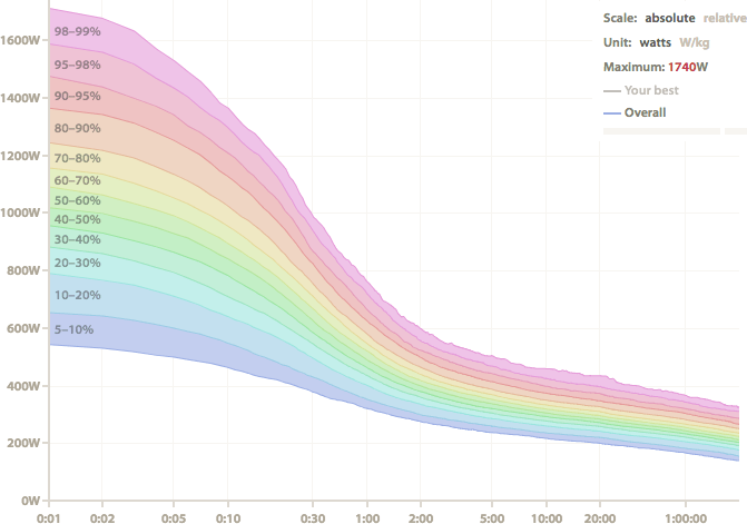 In cycling, it's a super common thing to know your Best Efforts Power Curve, which says how much mechanical power you can hold for any given duration. This graph is even fitted with percentiles, showing that only 2% of people can average 1600 Watts or more for 1 second. On the flip side, pretty much everyone can push about 550W for at least a second. I just got into cycling - even I can do it!