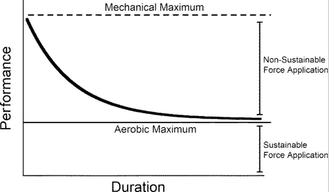 Maybe your technique deteriorates, so you try harder (increase metabolic energy demand) to keep the same mechanical output. This works until you get so tired that you either run the energy well dry, or your technique deteriorates further in a positive feedback loop. And this is typically what happens, with either pushing hard to the finish, or the piano falling before you get to the wall. If you've trained to have a lot of energy production, perhaps the well won't run dry. And if you have enough technique stability, maybe it won't collapse. But these are deliberate and trained adaptations.