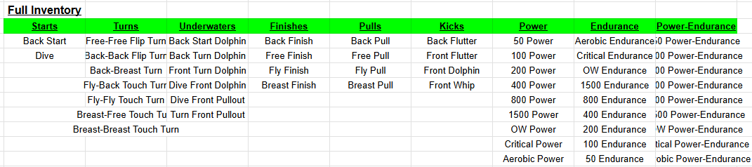 So if you look at every event, you can develop a Skill Inventory on Starts, Turns, Underwaters, Finishes, Pulls, Kicks, and you can even look at it in an energetic way in terms of Power or Endurance.