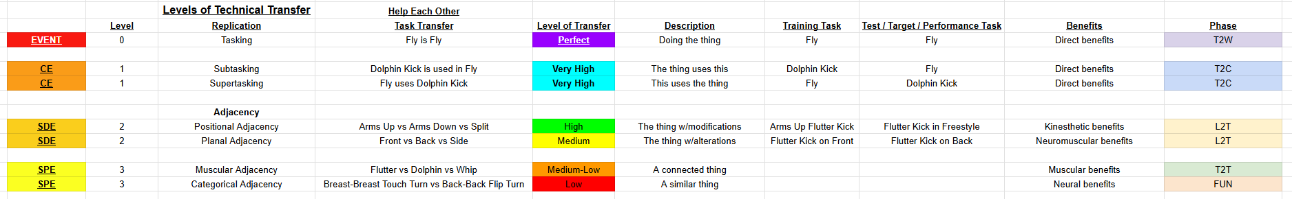 Some of these descriptions are open to interpretation (based on replicating race swimming in its entirety, being metabolically relevant, stimulating the same muscle groups, or preparing the organism), but here is how ASU coach Herbie Behm makes his categories: