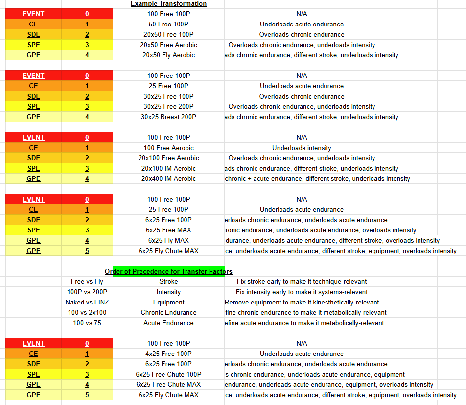 Now, there are a few caveats to this. First, training has to be reasonably specific. You can't just load up on 10K a day and expect your 50 Free to get better when you're doing 0 meters of 50 pace. This gives us the final letter in our acronym, T, for Transfer.