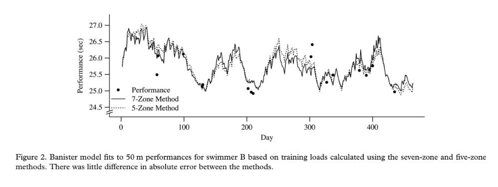 Here's something really cool from a 2020 paper out of Australia where the authors used this training load modelling to predict swimmer performances within a standard error of 0.62 seconds, but often MUCH less than that. Basically, you plug in the training, you plug in the times, and you can get how the swimmer adapts, and extrapolate their adaptation process to future training.